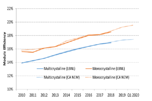 自從2010年以來,單晶硅和多晶硅的太陽能發(fā)電模塊組件效率逐漸提升,60片和72片多晶硅組件的效率每年平均增長0.3%~0.4%。2020年第一季度調(diào)查表明,單晶組件效率已經(jīng)達(dá)到19.5%。由于組件選擇可能因地區(qū)和行業(yè)而異,因此其效率和價格可能有所不同。