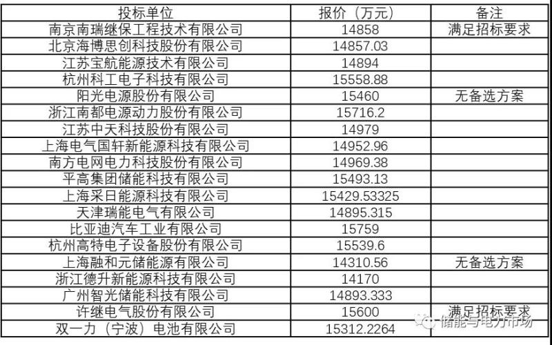 共19家企業(yè)參與投標(biāo),報(bào)價平均值為15139萬元,平均單價1.5139元/Wh。