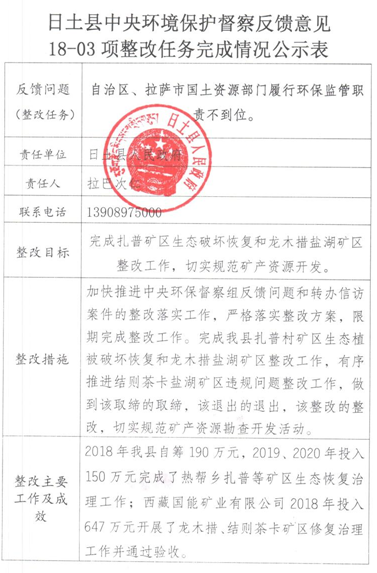 2020年11月26日,日土縣國土局發(fā)文《日土縣中央環(huán)境保護督察反饋意見18-03項整改任務(wù)完成情況公示》顯示,完成日土縣扎普村礦區(qū)生態(tài)植被破壞恢復(fù)和龍木措鹽湖礦區(qū)整改工作,做到該取締的取締,該退出的退出,該整改的整改,切實規(guī)范礦產(chǎn)資源勘查開發(fā)活動。
