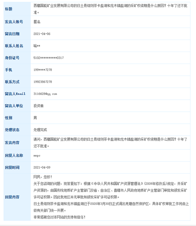 2021年4月,西藏城投公告稱,國能礦業(yè)于近日收到西藏自治區(qū)自然資源廳頒發(fā)的日土縣多瑪結(jié)則茶卡鹽湖礦區(qū)的《采礦許可證》。該證顯示,多瑪結(jié)則茶卡鹽湖礦區(qū)面積99.5555平方公里,生產(chǎn)規(guī)模1.00萬噸/年,有效期限10年,自2021年4月2日至2031年4月2日。
