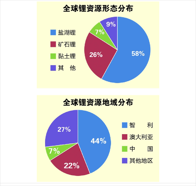 目前,澳洲鋰礦和南美鹽湖是全球鋰資源供應(yīng)主力。根據(jù)五礦證券數(shù)據(jù),從形態(tài)分布來看,全球鹽湖鋰、礦石鋰以及黏土鋰分別占比58%、26%和7%;以地域分布來看,智利、澳大利亞在全球探明鋰儲(chǔ)量中占比分別為44%、22%,中國(guó)以7%的占比位居第三。