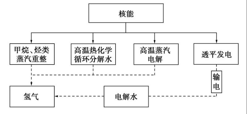 核能制氫所利用的主要是核反應產生的熱量。如圖2所示,核能制氫技術路線包括:高溫重整烴類制氫、高溫熱化學循環(huán)分解水制氫、高溫蒸汽電解制氫、核電電解水制氫。