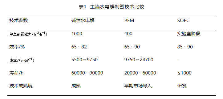 風電制氫的技術關鍵在于水電解制氫,水電解制氫技術主要有三種:堿性水電解制氫、純水質子交換膜(PEM)水電解制氫、固態(tài)氧化物電解池(SOEC)電解水制氫。如表1所示,堿性水電解制氫技術和PEM水電解制氫技術現(xiàn)已有商業(yè)化運行,前者較為成熟而后者由于成本較高暫處于早期商業(yè)化試驗階段,SOEC雖然效率較高但還處于研發(fā)示范階段。