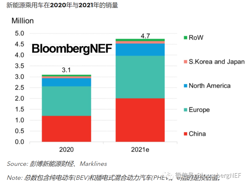 新能源乘用車2021年的全球銷量將超過470萬輛,較2020年提升約53%。彭博新能源財經(jīng)表示,在我們密切關(guān)注的所有地區(qū),新能源汽車的銷量都會出現(xiàn)成長,而中國和歐洲將繼續(xù)貢獻全球銷量的主要部分。