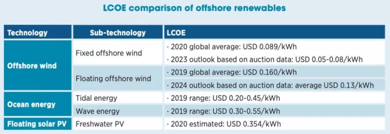 總體而言,海上可再生能源正迅速接近經(jīng)濟(jì)成熟,在某些地區(qū),相對(duì)于化石燃料發(fā)電,其成本已經(jīng)具有競(jìng)爭(zhēng)力。如下表所示,海上風(fēng)電的平準(zhǔn)化電力成本(LCOE)已創(chuàng)下歷史最低記錄,其他形式的海上可再生能源的成本預(yù)計(jì)將進(jìn)一步下降。IRENA預(yù)計(jì),到2023年固定底座海上風(fēng)電的LCOE將低至每千瓦時(shí)0.05美元至0.08美元,比2020年的LCOE 0.084美元/千瓦時(shí)下降近50%;而浮式海上風(fēng)電的LCOE預(yù)計(jì)到2024年將達(dá)到0.13美元/千瓦時(shí),低于目前固定基礎(chǔ)海上風(fēng)電的LCOE。預(yù)計(jì)到2030年,浮動(dòng)光伏發(fā)電價(jià)格將接近陸上地面安裝太陽能光伏發(fā)電價(jià)格。對(duì)于海洋能源技術(shù),2022年至2030年代初,潮汐能LCOE預(yù)計(jì)將達(dá)到0.11美元/千瓦時(shí);而到2025年,波浪能成本可能達(dá)到0.22美元/千瓦時(shí),到2030年將達(dá)到0.165美元/千瓦時(shí)。