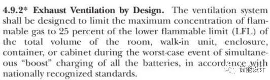 解讀:通風系統(tǒng)應能限制可燃氣體在最低爆炸極限(LFL)的25%以下,因此,需要設置可燃氣體探測器,以磷酸鐵鋰電池為例,熱失控時析出的可燃氣體以氫氣和一氧化碳為主,其中氫氣的LFL為4%,一氧化碳的LFL為12,5%,工程中設置相關可燃氣體探測器并與電池管理系統(tǒng)、通風系統(tǒng)進行聯(lián)動。