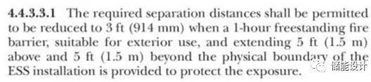 解讀:當設置耐火極限不小于1h的防火墻時(國內(nèi)防火墻耐火極限為3h),電池艙與建筑物、公用道路、易燃性材料等之間的防火間隔可減少至0.914m。防火墻長度和高度超出電池箱外廓各1.5m(國內(nèi)是超出外廓各1m的要求)。