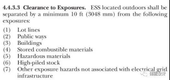 解讀:此條規(guī)定了戶外布置的電池艙與建筑物、公用道路、易燃性材料等防火間隔的要求,一般不少于3.048米。
