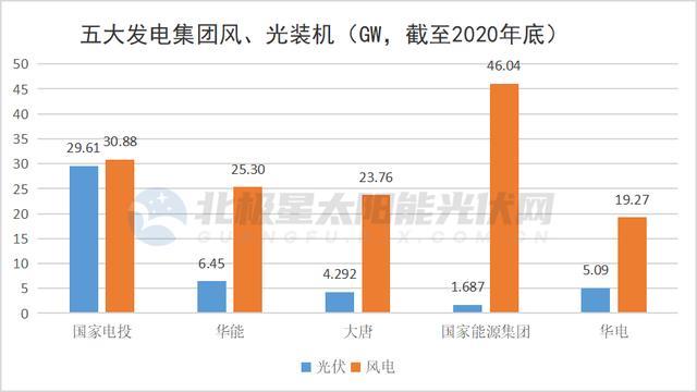 作為風(fēng)電開發(fā)容量前十企業(yè),從上圖可以看出,五大發(fā)電集團中,風(fēng)電累計裝機均超過光伏。不過,可以看到的是,除光伏“巨無霸”國家電投外,大唐、國家能源集團、華能、華電紛紛開始發(fā)力光伏。