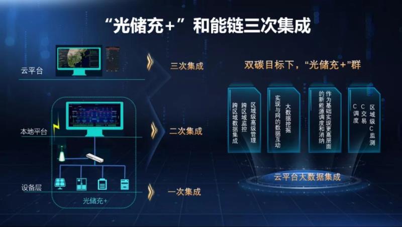 領充創(chuàng)新提出了對設備層、本地平臺、云平臺的三次集成技術,創(chuàng)建了“光儲充+”群的統(tǒng)籌管理體系。在設備層實現(xiàn)一次集成;通過站控層實現(xiàn)本地平臺可視可控,建立能源智慧管理系統(tǒng),完成二次集成;通過云平臺,進行三次集成,實現(xiàn)跨區(qū)域能源調(diào)度。