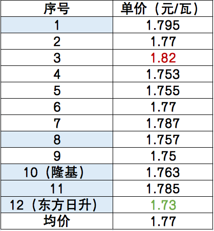 此前,光伏們曾獲取到神皖能源國能神皖安慶發(fā)電項目投標(biāo)企業(yè)的開標(biāo)價格,經(jīng)梳理發(fā)現(xiàn),在12家投標(biāo)企業(yè)中,一線組件企業(yè)報價正在全面貼近至平均線1.77元/瓦,2家一線組件企業(yè)報價低于平均價格。最高價來自于二線組件企業(yè),報價1.82元/瓦,頭部組件企業(yè)與二三線企業(yè)價差正在進一步縮小。