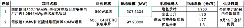 敦煌40MW和張掖40MW標(biāo)段招標(biāo)容量97.20308MW,組件規(guī)格要求為535~540雙玻半片組件,連云港神舟以1.77元/瓦位列第一中標(biāo)候選人,億晶光電以1.8元/瓦位列第二中標(biāo)候選人。具體見下: