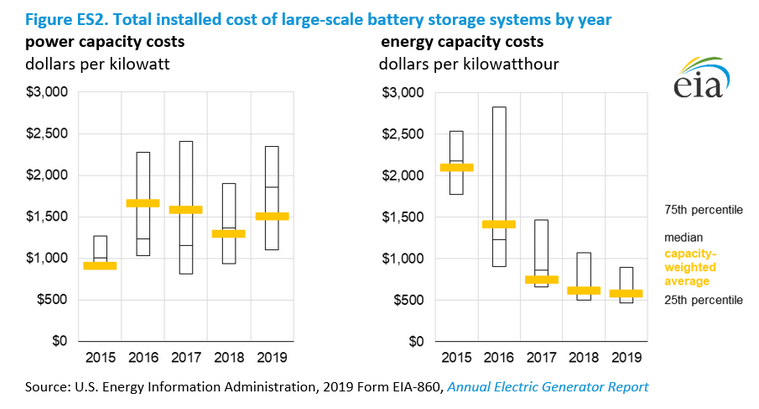中國儲能網(wǎng)訊:據(jù)外媒報道,美國能源部下屬的美國能源信息署(EIA)日前在發(fā)布的一份調(diào)查報告中預(yù)測,由于2015年到2019年期間電池儲能成本下降了72%,美國公用事業(yè)公司將在未來兩年內(nèi)為電網(wǎng)采購或部署裝機容量為10GW電池儲能系統(tǒng)。