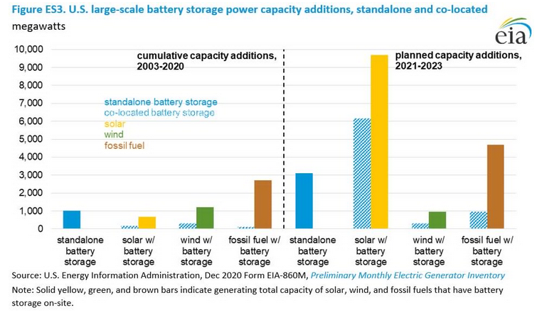 共址部署的太陽能發(fā)電設(shè)施和電池儲能項目數(shù)量預(yù)計將顯著增長。事實上,這是美國能源信息署(EIA)最為確定的對于目前到2023年儲能市場的發(fā)展趨勢。報告指出,美國計劃建設(shè)約100個配套部署電池儲能系統(tǒng)的太陽能發(fā)電設(shè)施,電池儲能項目的總裝機容量為7,689MW,而獨立部署的59座儲能系統(tǒng)的總裝機容量為3,115MW。