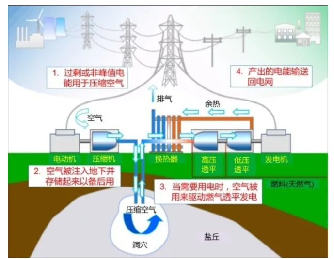你聽(tīng)過(guò)壓縮空氣儲(chǔ)能嗎?電力負(fù)荷低谷期將電轉(zhuǎn)發(fā)成能量?jī)?chǔ)存電力負(fù)荷高峰期釋放能量發(fā)電。