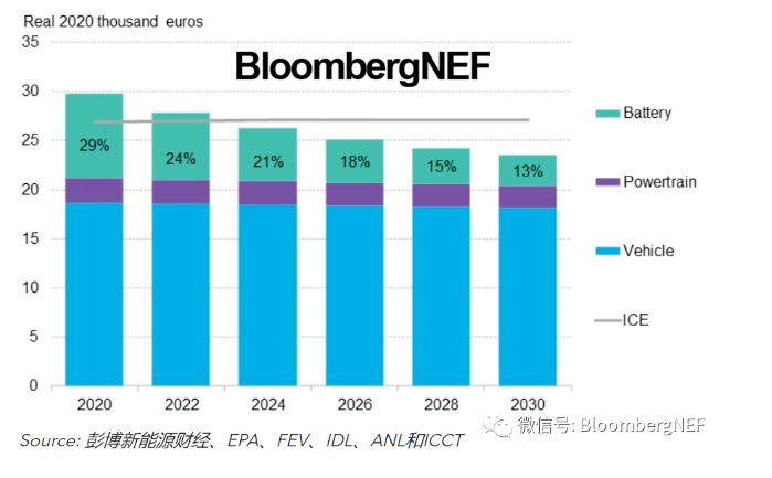 歐洲的大型車、美國的大型車和SUV等車型價格更高的細(xì)分領(lǐng)域最早有望在2023年實(shí)現(xiàn)平價。根據(jù)細(xì)分領(lǐng)域不同,電池占總制造成本的比重將在2023-2027年降至20%。