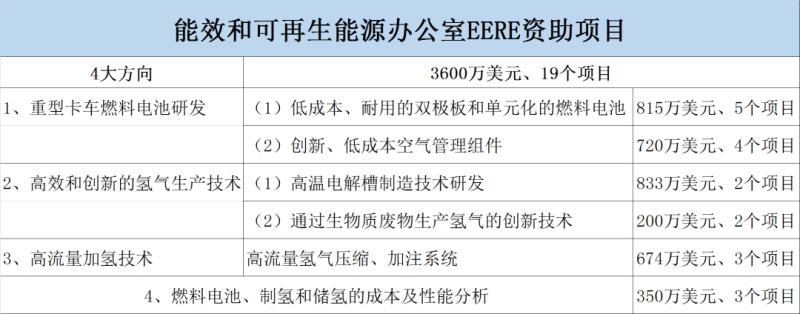 由能效和可再生能源辦公室(EERE)領(lǐng)導(dǎo)的項(xiàng)目占據(jù)DOE本次資助68.6%的資金和61.3%的項(xiàng)目名額,統(tǒng)籌關(guān)注氫能制取、儲(chǔ)運(yùn)、加注領(lǐng)域和燃料電池的研發(fā)、氫能重卡應(yīng)用等的完整氫生態(tài)閉環(huán),并具體針對(duì)電解槽制造、多途徑綠氫制備、雙極板、空氣系統(tǒng)、單元化燃料電池等技術(shù)進(jìn)行重點(diǎn)擊破,在燃料電池應(yīng)用端上則“押寶”氫能重卡。
