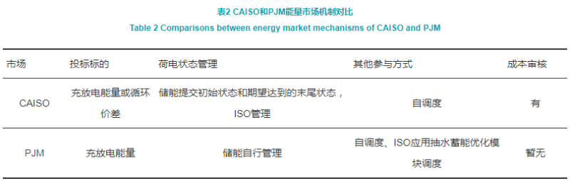 在FERC 841法案下,各ISO在選擇技術(shù)路線方面有一定的自主權(quán),本節(jié)以儲(chǔ)能規(guī)模最大的CAISO、PJM的市場(chǎng)機(jī)制為例進(jìn)行分析,見表2。