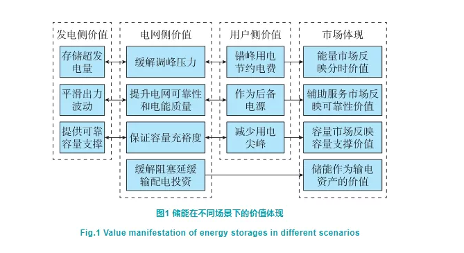 值得注意的是,儲(chǔ)能提供的同一項(xiàng)服務(wù),對(duì)于不同主體有不同的表現(xiàn)形式[20],如圖1所歸納。如削峰填谷,對(duì)電網(wǎng)而言表現(xiàn)為緩解調(diào)峰壓力[21],對(duì)新能源而言表現(xiàn)為存儲(chǔ)超發(fā)電量[22],對(duì)用戶而言表現(xiàn)為錯(cuò)峰用電[23]。由于本文的落腳點(diǎn)在于市場(chǎng)機(jī)制,從市場(chǎng)的角度來看,以上3個(gè)價(jià)值均可以通過能量市場(chǎng)分時(shí)的價(jià)格信號(hào)加以體現(xiàn),由市場(chǎng)采購并統(tǒng)一提供。當(dāng)然,這些服務(wù)也可由發(fā)電側(cè)、用電側(cè)主體與儲(chǔ)能簽訂使用協(xié)議而自行購買。具體選擇哪種模式,是儲(chǔ)能市場(chǎng)設(shè)計(jì)中待探討的問題。