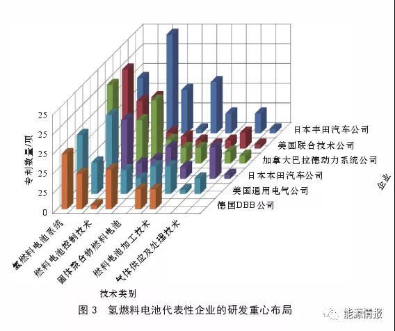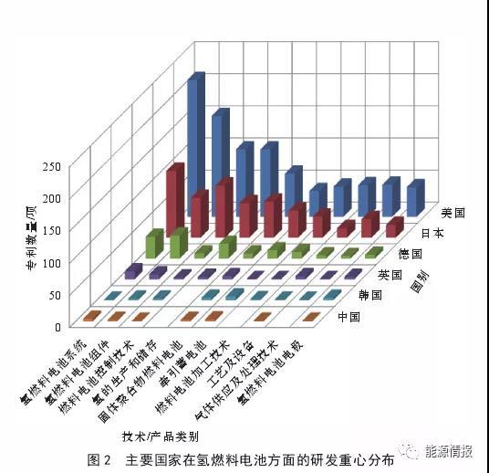 近年來,我國的氫燃料電池技術(shù)基礎(chǔ)研究較為活躍,在一些技術(shù)方向具備了與發(fā)達(dá)國家“比肩”的條件;但整體來看,所掌握的核心技術(shù)水平、綜合技術(shù)體系尚不及具有領(lǐng)先地位的國家,如我國在1998年才出現(xiàn)首個(gè)氫燃料電池發(fā)明專利,目前相關(guān)核心專利數(shù)僅占世界的1%左右。先發(fā)國家在氫燃料電池系統(tǒng)、組件、控制技術(shù)、電極等方面發(fā)展相對(duì)均衡,一些國際性企業(yè)在燃料電池系統(tǒng)、電池組件與加工、控制技術(shù)等方面居于世界領(lǐng)先地位(見圖2、圖3)。