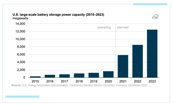 根據(jù)美國能源信息署的數(shù)據(jù),2020年美國的大規(guī)模電池存儲容量繼續(xù)保持顯著增長趨勢,美國電池容量在2020年增長了35%,達到1650兆瓦。在過去5年中美國電池儲能容量已經增長了三倍,這一趨勢預計將繼續(xù)下去,在2021年至2023年期間美國可新增10000兆瓦以上的大型電池儲能,是2019年容量的10倍。