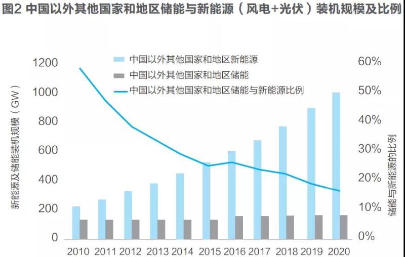 儲能是解決高比例新能源并網(wǎng)消納的重要支撐,儲能產(chǎn)業(yè)的發(fā)展得到了高度重視。近年來中國及全球儲新比數(shù)據(jù)的下降幅度都已經(jīng)明顯趨緩;考慮儲能技術(shù)的發(fā)展和市場需求,預(yù)計(jì)中國以外世界其他國家和地區(qū)的儲新比有可能在2024年左右達(dá)到最低值,預(yù)計(jì)為13-15%左右,之后趨于穩(wěn)定或略有回升。假設(shè)全球風(fēng)電和光伏裝機(jī)按照平均每年10%的增速發(fā)展,到2030年累計(jì)裝機(jī)將達(dá)3900GW;而全球儲能裝機(jī)規(guī)模若按13-15%的比例計(jì)算,2030年將達(dá)507-585GW的規(guī)模(截至2020年底為192.2GW)。