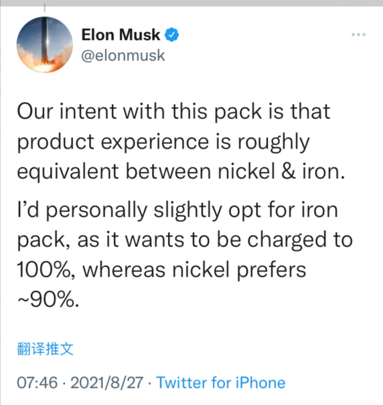 在部分車主咨詢兩個車型差別的 Twitter 下方,馬斯克回應稱,自己更喜歡磷酸鐵鋰電池,因為可以充電到 100%,而三元鋰電池只建議到 90%。