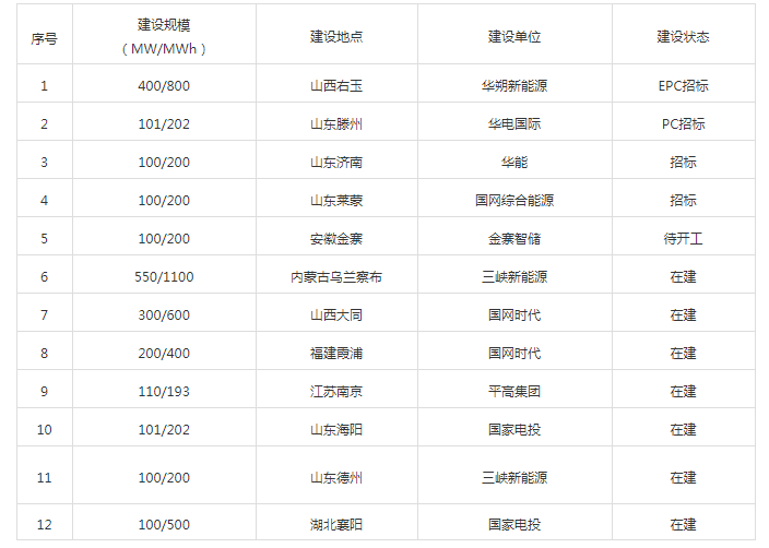 據(jù)公開數(shù)據(jù)統(tǒng)計(jì),國內(nèi)部分待建或在建的大型儲能電站如下表所示,另外,尚有多個大型儲能電站處于前期策劃或開發(fā)階段。