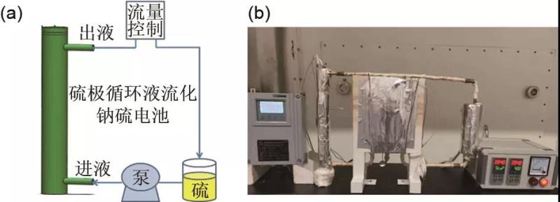 鈉硫電池最大的安全隱患來(lái)源于鈉和硫反應(yīng)時(shí)的劇烈放熱,因此如何有效地控制陶瓷管受損時(shí)直接接觸的鈉或/和硫的質(zhì)量將成為從根本上改善鈉硫電池安全性的一個(gè)重要方向。液流電池作為一種技術(shù)較為成熟的儲(chǔ)能電池體系,其特點(diǎn)是活性物質(zhì)具有流動(dòng)性,可以實(shí)現(xiàn)電化學(xué)反應(yīng)場(chǎng)所(電極)與儲(chǔ)能活性物質(zhì)在空間上的分離,安全性高,電池功率與容量設(shè)計(jì)相對(duì)獨(dú)立,適合大規(guī)模蓄電儲(chǔ)能需求,但是傳統(tǒng)液流電池還存在能量密度較低、電流密度低、材料成本和制造成本高等問(wèn)題。如果將鈉硫電池液流化,那么在保持鈉硫電池優(yōu)勢(shì)的同時(shí),可以有效地提高鈉硫電池的安全性。最近,SICCAS進(jìn)行了管式液流化鈉硫電池結(jié)構(gòu)原型的設(shè)計(jì)和開(kāi)發(fā)工作(專利申請(qǐng)?zhí)?02110113570.1),圖18(a)和18(b)分別顯示了這種管式液流化鈉硫電池的結(jié)構(gòu)示意圖和原型電池。與典型的液流電池不同,電池鈉負(fù)極限制在負(fù)極腔室,硫正極單獨(dú)從下至上通過(guò)泵送在正極腔室循環(huán)流動(dòng)。鈉硫電池液流化的結(jié)構(gòu)設(shè)計(jì)主要有兩個(gè)方面的優(yōu)勢(shì):一方面,鈉硫電池液流化可有效地提高鈉硫電池的安全性。組件內(nèi)部設(shè)置溫度傳感器,一旦電池超溫,溫度控制器輸出報(bào)警信號(hào),隨即切斷外部循環(huán)管道閥門(mén)以保證系統(tǒng)的安全;另一方面,鈉硫電池液流化可進(jìn)一步提高鈉硫電池的能量輸出能力。正負(fù)極材料通過(guò)外部罐體存儲(chǔ),電池容量經(jīng)過(guò)匹配正負(fù)極材料的質(zhì)量和罐體的容積得以大幅提高。當(dāng)然這一設(shè)計(jì)的實(shí)現(xiàn)還存在諸多技術(shù)難點(diǎn),例如大面積陶瓷電解質(zhì)膜的可靠制備;電芯與接觸液體部件的熱管理;高溫循環(huán)泵的選型等。