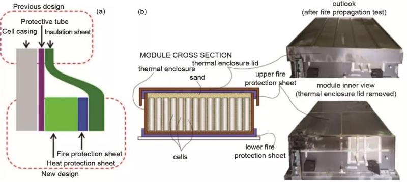 一旦發(fā)生火情,在阻斷火源方面,用砂填埋電芯是較為傳統(tǒng)的設(shè)計(jì),但是砂的透氣性以及較好的導(dǎo)熱性使其無(wú)法達(dá)到阻熱和阻隔泄漏物的目的。目前鈉硫電池模組采用電芯間隔熱防火板和保溫箱防火板相結(jié)合的方式實(shí)現(xiàn)進(jìn)一步阻斷火勢(shì)蔓延的目的。每個(gè)電芯單元都用隔熱防火板卷繞,在物理上與相鄰電芯隔離[圖15(a)]。保溫箱上層和下層均加入透氣防火板,實(shí)現(xiàn)了保溫箱之間的隔離。通過(guò)這種措施,幾乎完全消除了熱外逸的可能性[圖15(b)]。