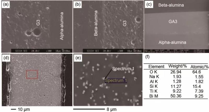 圖12 (a,b) 100次熱沖擊后,摻雜3.0% Y2O3的玻璃陶瓷(G3)和α-Al2O3或β"-Al2O3之間的界面截面;(c) α-Al2O3,β"-Al2O3與摻雜質(zhì)量分?jǐn)?shù)32%Bi2O3的硼硅酸玻璃(GA3)的密封界面截面;(d,e) 經(jīng)硫腐蝕的含鉍玻璃陶瓷的封接界面及局部微晶放大圖片;(f)(e) 圖指向部分的EDS半定量分析結(jié)果