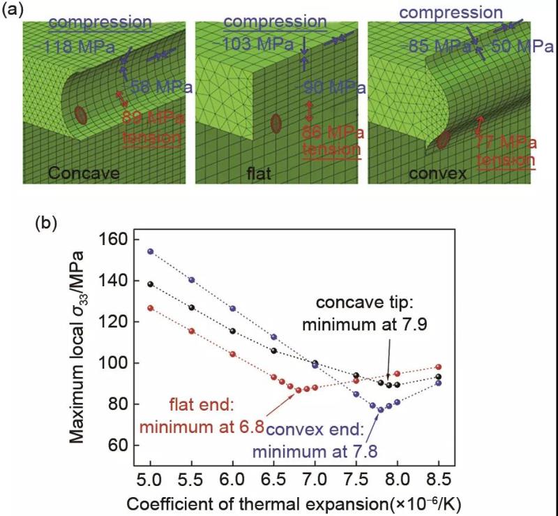 圖11 (a) 凸、平和凹三種尖端形狀的玻璃密封件在熱震過(guò)程中承受的局部應(yīng)力計(jì)算結(jié)果;(b) 最大局部應(yīng)力與玻璃熱膨脹系數(shù)之間的關(guān)系