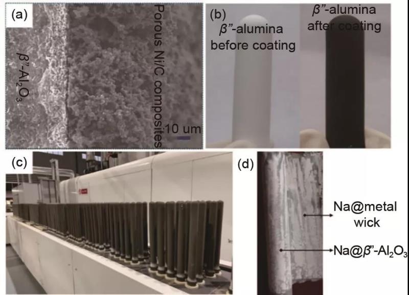 圖10 (a,b) 多孔鎳/碳復(fù)合薄膜修飾的β"-Al2O3陶瓷;(c) 多孔鎳/碳復(fù)合薄膜修飾層的量化制備系統(tǒng);(d) 鈉在鎳/碳復(fù)合薄膜修飾后的β"-Al2O3陶瓷管上良好潤(rùn)濕