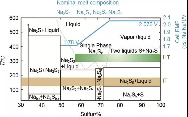 鈉硫電池的工作溫度控制在300~350 ℃,此時(shí)鈉與硫均呈液態(tài),β"-Al2O3具有高的離子電導(dǎo)率(約0.2 S/cm),電池具有快速的充放電反應(yīng)動(dòng)力學(xué)。理解鈉硫電池的工作溫度是重要的。圖3顯示了Na2Sx的相圖,圖中上部藍(lán)色曲線為電池300 ℃下的理論放電曲線,虛線對(duì)應(yīng)了不同放電深度反應(yīng)產(chǎn)物的熔點(diǎn)。Na2S4作為正極主要放電產(chǎn)物,其熔點(diǎn)為290 ℃,因此工作溫度降低不僅影響固體電解質(zhì)β"-Al2O3的鈉離子導(dǎo)電性,還會(huì)造成放電深度降低。溫度高于400 ℃時(shí),正極熔體氣化導(dǎo)致電池內(nèi)壓上升,影響電池安全運(yùn)行。