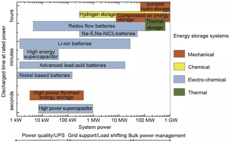 圖1 各種大規(guī)模儲(chǔ)能系統(tǒng)適應(yīng)的應(yīng)用場(chǎng)景