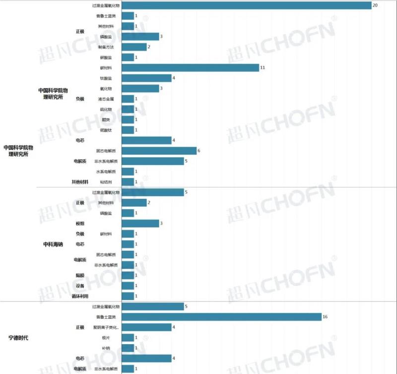 上圖可清晰的反映中科院物理所(中科海鈉)和寧德時(shí)代研究重點(diǎn)均在正極材料技術(shù)領(lǐng)域。