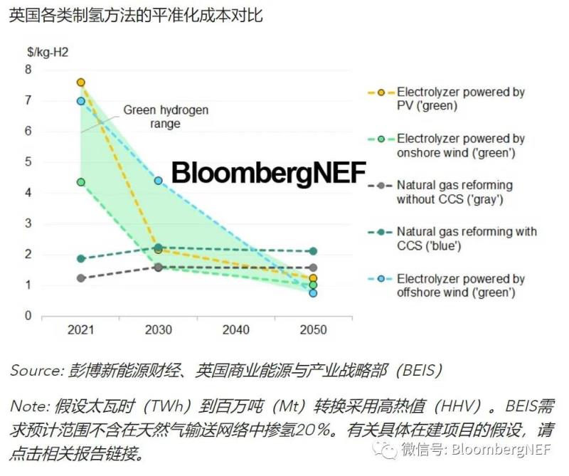 該戰(zhàn)略對“藍(lán)氫”和“綠氫”之爭保持中立。到2030年,英國政府計(jì)劃重點(diǎn)關(guān)注“藍(lán)氫”,即配合碳捕集和封存技術(shù)(CCS)的天然氣制氫,隨后再開始支持成本逐漸下降的電解水制備“綠氫”。