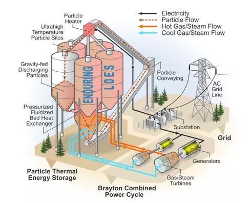 當需要能量時,加熱的硅砂通過熱交換器重力供給,加熱和加壓內(nèi)部的工作氣體,以驅(qū)動渦輪機械和旋轉(zhuǎn)發(fā)電機從而為電網(wǎng)發(fā)電。該系統(tǒng)在高電力需求期間以及太陽能或風能等有限的間歇性電源不可用時放電。