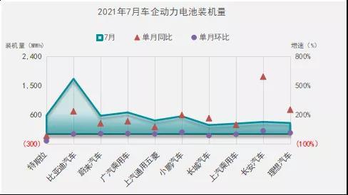 7月,比亞迪汽車電池裝機(jī)量一騎絕塵,環(huán)比變化較小,同比增幅大;其次是特斯拉、蔚來、廣汽乘用車和小鵬,月裝機(jī)量均超過500MWh。同比方面:因?yàn)殇N量增長較大,7月長安和理想電池裝機(jī)量增速也非常顯著。