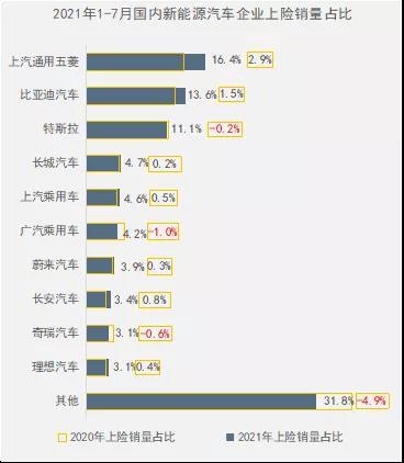TOP10零售銷量市占率共計(jì)68.2%,較2020年增加4.9%;TOP3上汽通用五菱、比亞迪和特斯拉,占比41.1%;其他車企市占率在3%-5%之間。