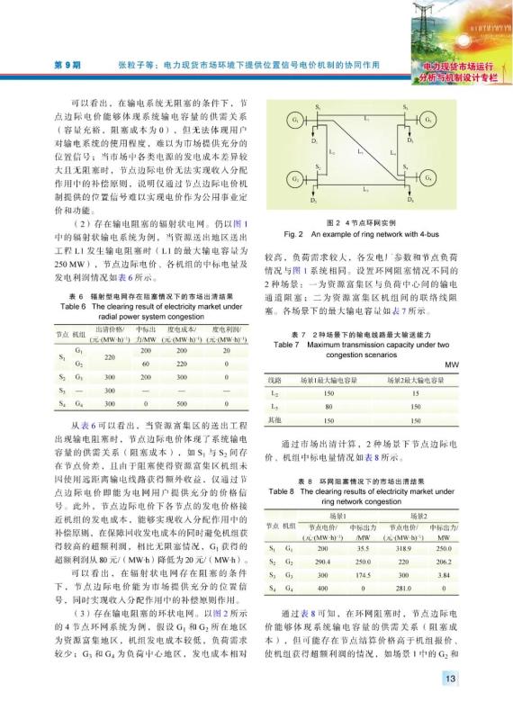 (3)在無阻塞電網(wǎng)中,節(jié)點(diǎn)邊際電價(jià)提供的位置信號(hào)不充分,其原因在于沒有體現(xiàn)輸電成本的公平分?jǐn)?,需要采取分區(qū)輸電定價(jià)機(jī)制予以配合;在輻射網(wǎng)阻塞時(shí),節(jié)點(diǎn)邊際電價(jià)提供的位置信號(hào)能夠有效實(shí)現(xiàn)電價(jià)作為公用事業(yè)價(jià)格的功能,無需分區(qū)輸電定價(jià)的配合;在環(huán)網(wǎng)阻塞時(shí),節(jié)點(diǎn)邊際電價(jià)提供的位置信號(hào)不能充分實(shí)現(xiàn)電價(jià)作為公用事業(yè)定價(jià)的作用,產(chǎn)生這一現(xiàn)象的原因之一是為滿足系統(tǒng)運(yùn)行約束,造成的機(jī)組出力調(diào)整產(chǎn)生的,需要通過未來的源網(wǎng)投資予以解決。