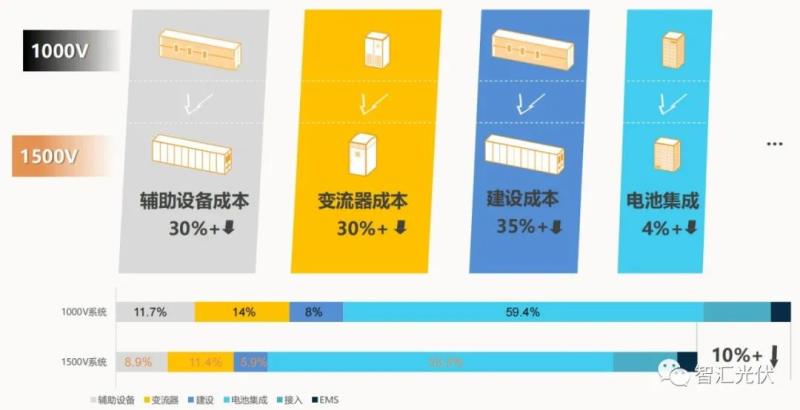 隨著1500V系統(tǒng)在光伏項目中的應(yīng)用,儲能系統(tǒng)也逐漸從1000V提高到1500V,將降低電站投資約10%,效率提升約0.6%。