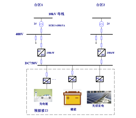 領充推出多臺區(qū)低壓側(cè)柔性互聯(lián)方案,通過柔性互聯(lián)裝置實現(xiàn)多臺區(qū)容量共享,主動環(huán)網(wǎng)設計,實現(xiàn)分布式電源和儲能系統(tǒng)以及電動汽車充電的接入;通過潮流控制,分布式電源消納,電動汽車有序充放電綜合實現(xiàn)多饋線柔性互供,提高配電網(wǎng)的能控水平,實現(xiàn)網(wǎng)源荷儲充協(xié)調(diào)優(yōu)化運行,從而有效降低臺區(qū)停電風險,保障多臺區(qū)的供電可靠性。