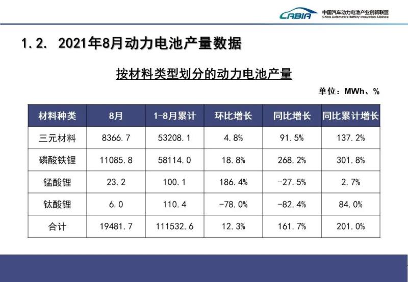 產量方面,2021年8月,我國動力電池產量共計19.5GWh,同比增長161.7%,環(huán)比增長12.3%。其中三元電池產量8.4GWh,占總產量42.9%,同比增長91.5%,環(huán)比增長4.8%;磷酸鐵鋰電池產量11.1GWh,占總產量56.9%,同比增長268.2%,環(huán)比增長18.8%。1-8月,我國動力電池產量累計111.5GWh,同比累計增長201.0%。其中三元電池產量累計53.2GWh,占總產量47.7%,同比累計增長137.2%;磷酸鐵鋰電池產量累計58.1GWh,占總產量52.1%,同比累計增長301.8%。