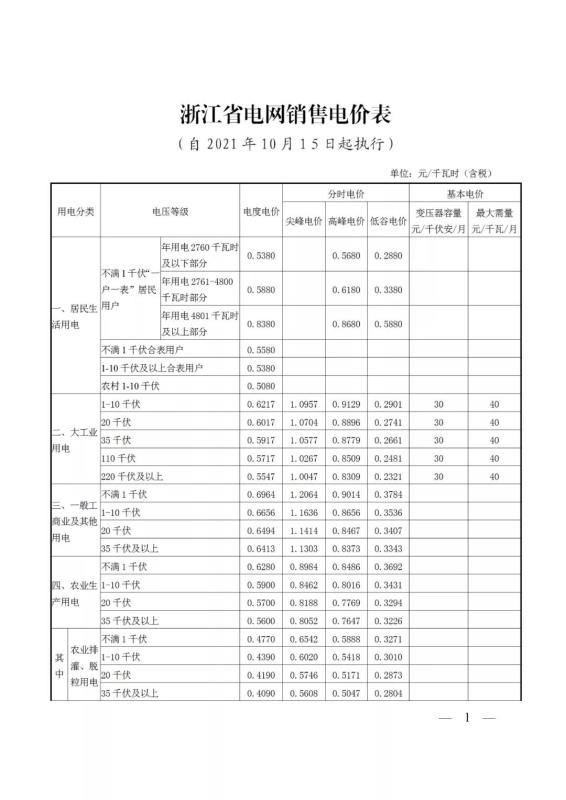 附表:浙江省電網(wǎng)銷售電價(jià)表