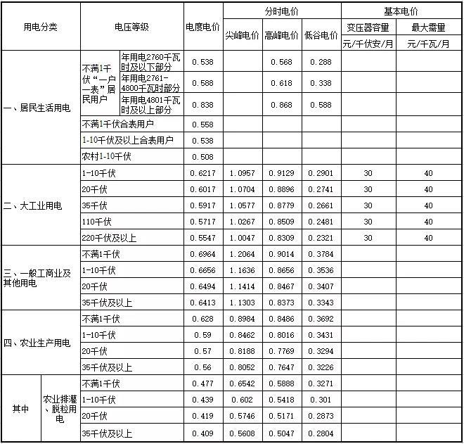 注:1.上表所列價格,均含國家重大水利工程建設(shè)基金0.403875分錢;除農(nóng)業(yè)生產(chǎn)用電以外,均含大中型水庫移民后期扶持資金0.62分錢;除農(nóng)業(yè)生產(chǎn)用電外,均含可再生能源電價附加,其中居民生活用電0.1分錢 、其余各類用電1.9分錢;核工業(yè)鈾擴散廠和堆化工廠生產(chǎn)用電價格,按上表所列的分類電價降低1.7分錢執(zhí)行。