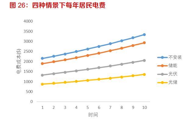 根據(jù)計算結(jié)果,十年里,四種情景下光儲系統(tǒng)的每年電費比不安裝光伏和儲能系統(tǒng)低 59%;安裝 光伏比不安裝低 38%;由于美國居民用電量高,且峰谷價差大,安裝儲能的年用電費也比不安裝 低 12%。綜合設(shè)備成本、設(shè)備維護(hù)費用及電費來看,相比于不安裝的情景,在全壽命周期內(nèi),安裝 光儲及單獨安裝光伏都具備一定的經(jīng)濟性,單獨安裝光伏的累計成本為$23918.93,安裝光儲系統(tǒng) 的累計成本為$22422.01。使用時間超過 8 年,安裝光儲系統(tǒng)相比于其他方案跟節(jié)約成本。