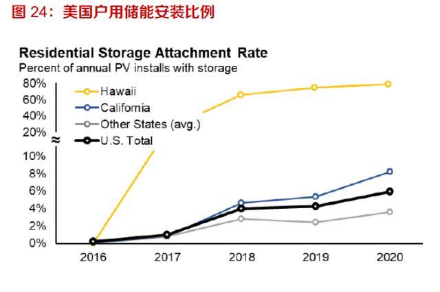 家庭安裝光儲系統(tǒng)可以獲得明顯的經(jīng)濟收益。根據(jù)伯克利實驗室的統(tǒng)計,截至 2020 年表后側(cè)安裝 儲能容量約為 1000MW,其中 550MW 與太陽能光伏配對。目前絕大多數(shù)戶用儲能與光伏配對 (80%),非住宅儲能只有 40%與光伏共建。美國戶用光儲共建比例最高的是夏威夷州,其次是 加州。電化學(xué)儲能系統(tǒng)的成本逐年下降,目前光儲系統(tǒng)的成本在$5/W,聯(lián)邦范圍內(nèi)安裝光儲系統(tǒng) 可以獲得 ITC 稅收減免 30%,亞利桑那州、加州等提供額外的光儲系統(tǒng)退稅,用戶可以通過峰谷 套利、自發(fā)自用等方式節(jié)省用電費用。光儲系統(tǒng)使用 5-10 年之后可以回收部分成本。綜合計算后 系統(tǒng)可以獲得$500-1000/kWh 的經(jīng)濟收益。
