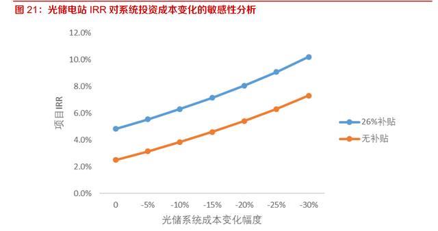 隨著未來光伏和儲能設(shè)備的降價,將會增加進(jìn)一步增加安裝設(shè)備的經(jīng)濟性。我們測算了光伏系統(tǒng)和 儲能系統(tǒng)價格下降對于光儲系統(tǒng) IRR 的影響。結(jié)果發(fā)現(xiàn),以當(dāng)前的價格為基礎(chǔ),根據(jù) BNEF 統(tǒng)計, 目前戶用儲能系統(tǒng)費用在$684/kW 左右;根據(jù)SEIA,目前戶用光伏系統(tǒng)硬件和安裝費用$2930/kW, 當(dāng)光伏系統(tǒng)和儲能系統(tǒng)的價格下降幅度超過 10%后,家用光儲系統(tǒng) IRR 將高于 10%,具有明顯的 經(jīng)濟性。
