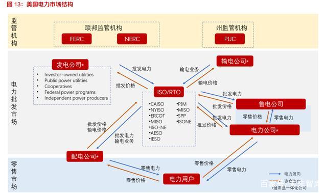 美國電力體系的市場化成熟,形成了由聯(lián)邦層面的 FERC(美國聯(lián)邦能源監(jiān)管委員會)和 NERC (北美可靠電力公司)以及州層面的 PUC(公用事業(yè)委員會)監(jiān)管的市場體系。美國的電力系統(tǒng)被劃分為東部網(wǎng)(Eastern Interconnection)、西部網(wǎng)(Western Interconnection)和德 州網(wǎng)(Electric Reliability Council of Texas, ERCOT)三大區(qū)域電網(wǎng)。在電網(wǎng)內(nèi)劃分為多個區(qū) 域市場。市場主體是 RTO(區(qū)域傳輸組織)或 ISO(獨立系統(tǒng)運營方)。